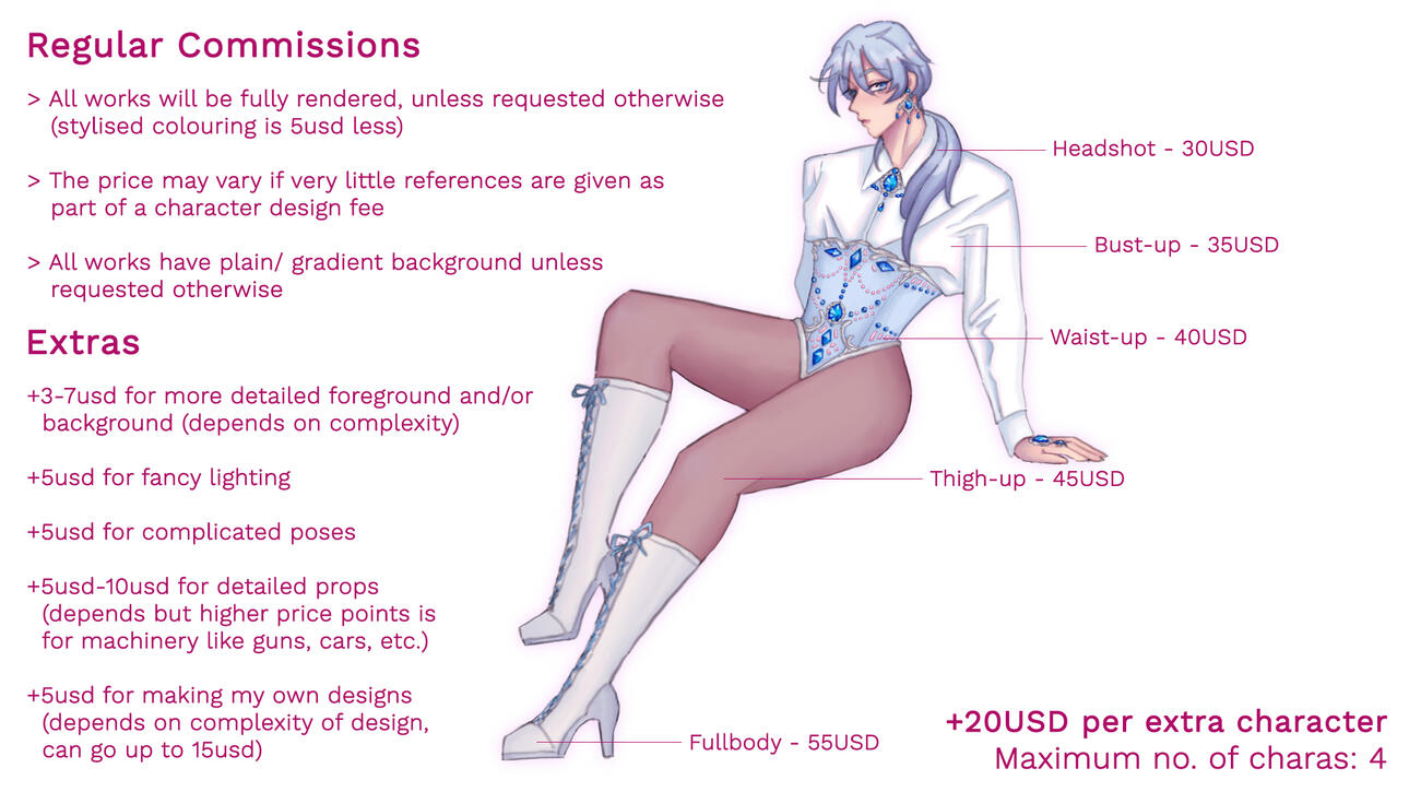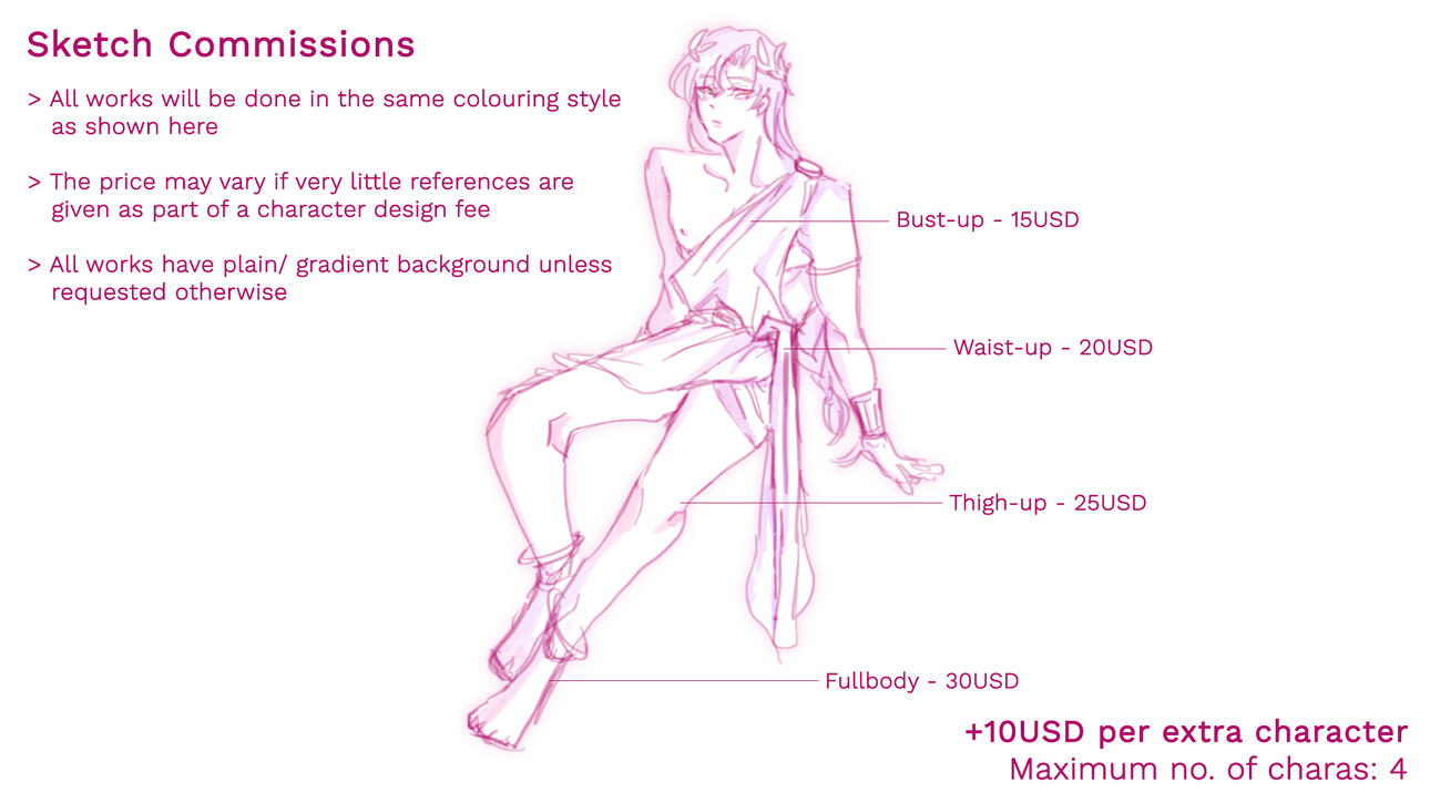 (Unless you are a Singapore resident, then local bank transfer is also okay)4. My commissions are for personal use only. Using my commissions for commercial use (e.g re-selling or reprinting this into merchandise to sell) is NOT allowed.5. I strictly DO NOT ALLOW my art being used for anything AI or NFT related.6. If you would like to commission me for commercial work, please contact me personally to discuss beforehand. Prices will vary in that case.7. I require a full deposit or half deposit at minimum before I work on your commission.8. A sketch will be given for you at approval stage. Any major edits and revisions must be made at this stage. This includes significant changes to the pose or body shape or any redrawing required.9. After the sketch has been approved, I will not accept any major changes. Minor edits like colours is fine though.10. I have the right to decline any commission requests without reason.11. Refunds will not be accepted if the final sketch has been shared.12. I usually take 2 weeks maximum to finish a commission upon receiving payment/ deposit, but I may require more time depending on my schedule. In this case I will definitely inform you.13. If you have a specific deadline in mind or want to skip my queue, I will charge extra.14. Please do not take credit of the artwork commissioned. I, the artist, retain all rights to it as my intellectual property. the client may not claim ownership of it and use it for anything other than personal use.15. (For regular and sketch commissions only) You will receive two versions of the artwork- one without the watermark, so that it is used better for headers or icons and that you can use in private, and one with the watermark, which I will require you to use and post if you put it up anywhere on social media.16. Please do not edit my watermark out for my outfit commissions.17. I do not allow modifying, or tracing any commissioned pieces in any form. If you have any minor colour edits you would like to make, you can ask me to do it directly.18. Please note that my skills as an artist are constantly evolving, so there may be slight differences between my website samples and the illustration you will receive.